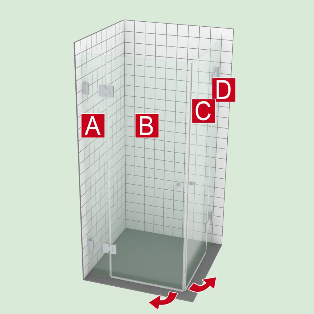 Für die Bestellung der Duschkabine sind Flächenangaben erforderlich. Diese Flächen sind in der Duschkabinen-Ansicht mit einem weiß-roten Großbuchstaben (A, ...) gekennzeichnet.