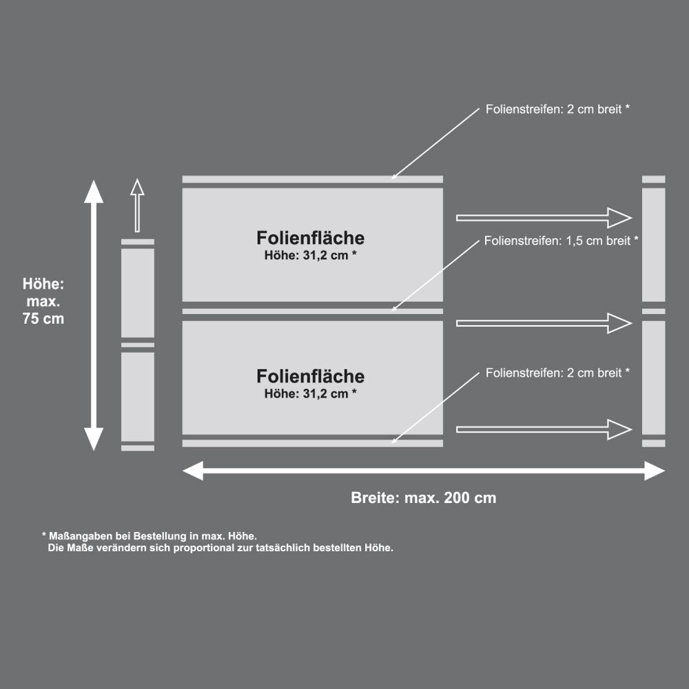 Die Foliengrößen sind frei wählbar. Bitte beachten Sie die hinterlegten min. und max. Angaben in den Eingabefeldern.